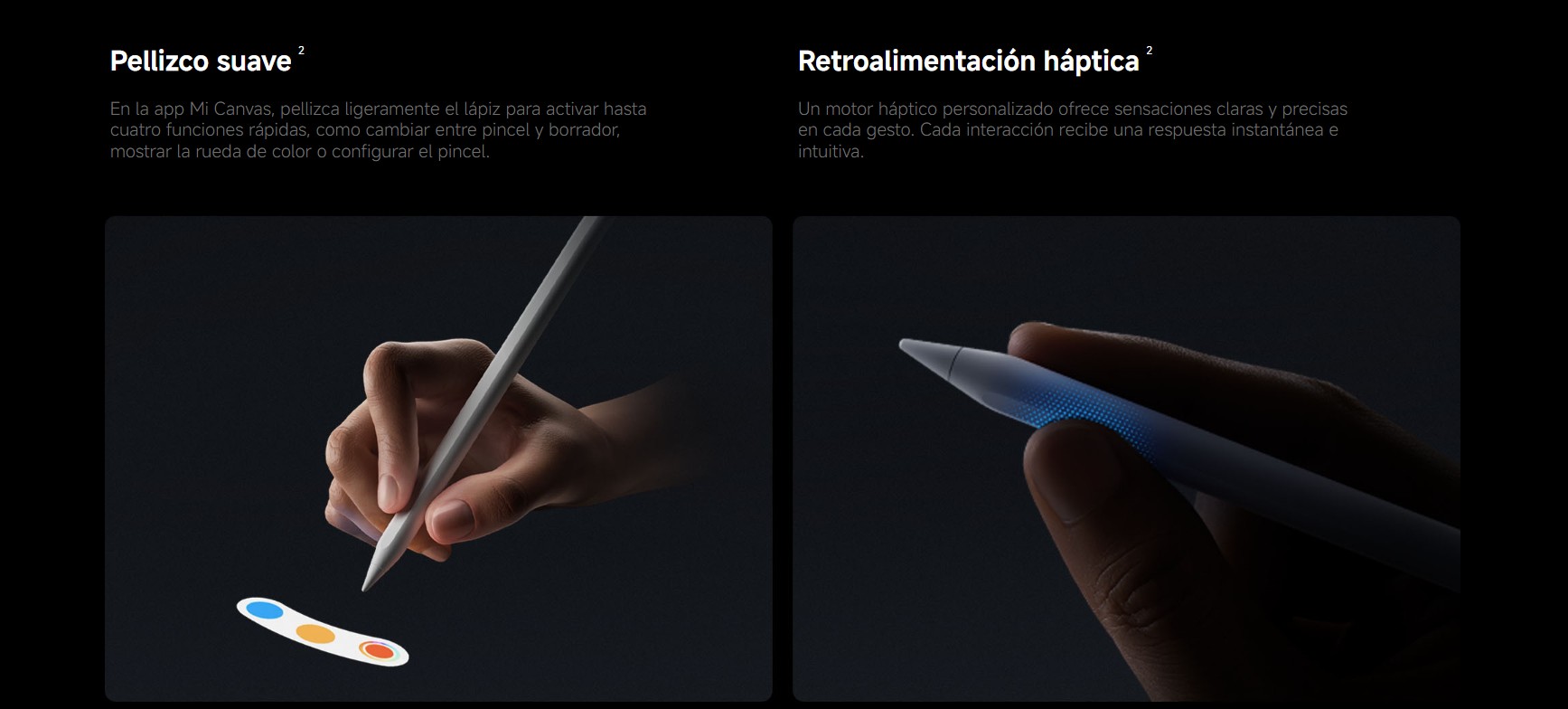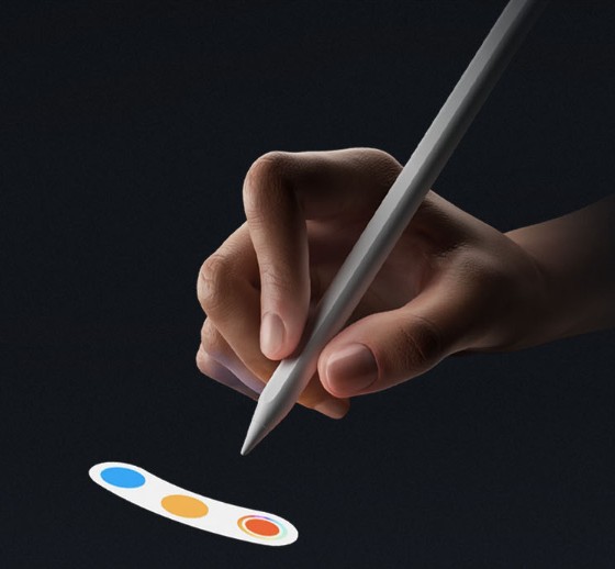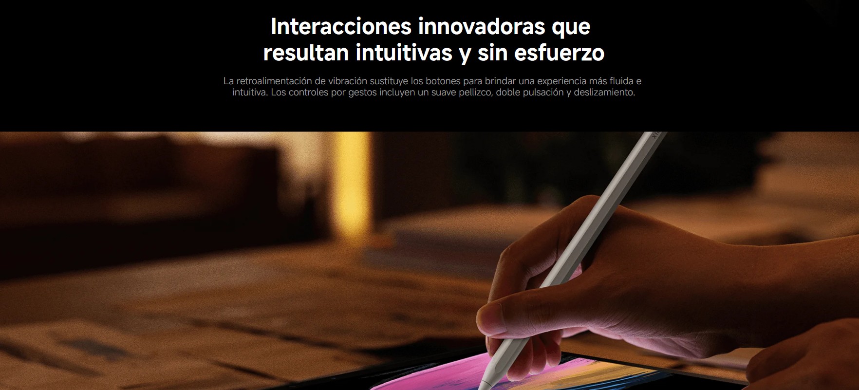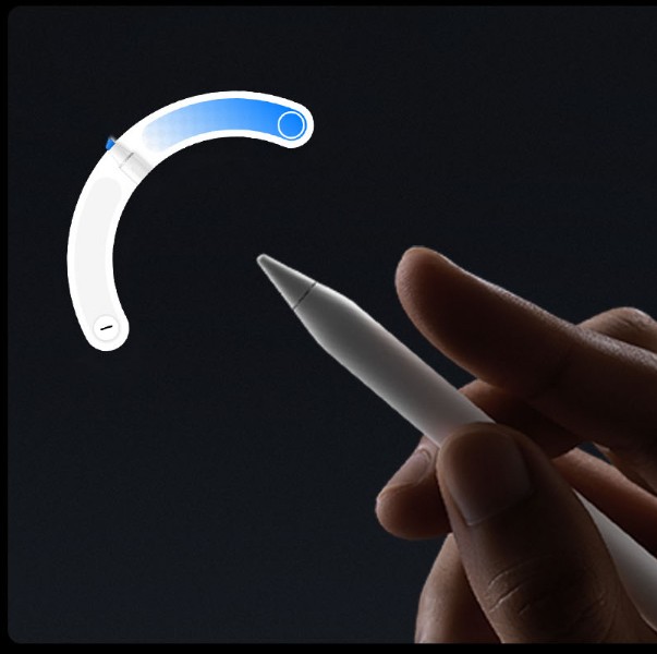 Tiene un motorcito interno (háptico) que te da un toquecito cuando haces algo, para que sientas que “has pulsado” aunque no haya botón, si aprietas un poco el cuerpo del lápiz, se abre el menú de colores o pinceles, puedes subir o bajar el grosor del trazo simplemente deslizando el dedo por el lateral del lápiz, como si fuera una barra de volumen.