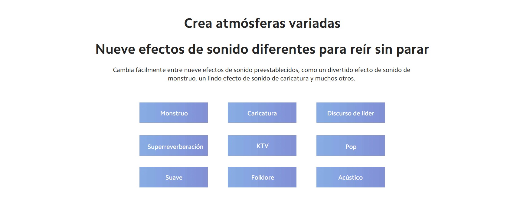 Cambia fácilmente entre 9 efectos de sonido preestablecidos, como una voz de monstruo, un tono caricaturesco y muchos más. Perfectos para darle un toque divertido a tus grabaciones, llamadas o sesiones de karaoke. Simplemente el complemento perfecto para tus reuniones con amigos y disfrutar de sesiones de risas sin parar.