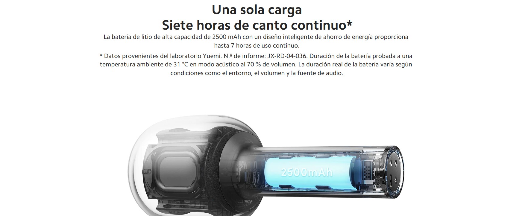 Con una sola carga, la batería de litio de 2500 mAh te permite disfrutar de hasta 7 horas seguidas de karaoke. Gracias a su diseño eficiente, el micrófono ahorra energía para que sigas cantando sin interrupciones.